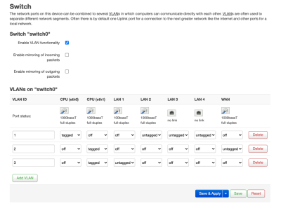 Navigate to LuCI → Network → Switch to create second VLAN.