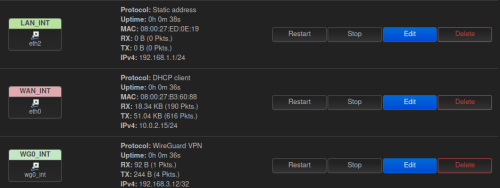 # /etc/config/network config interface 'loopback' option device 'lo' option proto 'static' option ipaddr '127.0.0.1' option netmask '255.0.0.0' config interface 'wan_int' option proto 'dhcp' option device 'eth0' config interface 'wg0_int' option proto 'wireguard' option private_key 'XXXXXXXXXXXXXXXXXXXXXXXXXXXXXXXXXXXXXXXXXXX' list addresses '192.168.3.100/32' config wireguard_wg0_int option description '<Peer_name>' option public_key 'XXXXXXXXXXXXXXXXXXXXXXXXXXXXXXXXXXXXXXXXXXX' option preshared_key 'XXXXXXXXXXXXXXXXXXXXXXXXXXXXXXXXXXXXXXXXXXX' list allowed_ips '0.0.0.0/0' option route_allowed_ips '1' option endpoint_port '<Peer_port>' option persistent_keepalive '15' option endpoint_host '<Peer_IP_or_FQDN>' config interface 'lan_int' option proto 'static' option device 'eth2' option ipaddr '192.168.1.1' option netmask '255.255.255.0' option delegate '0' option defaultroute '0'
