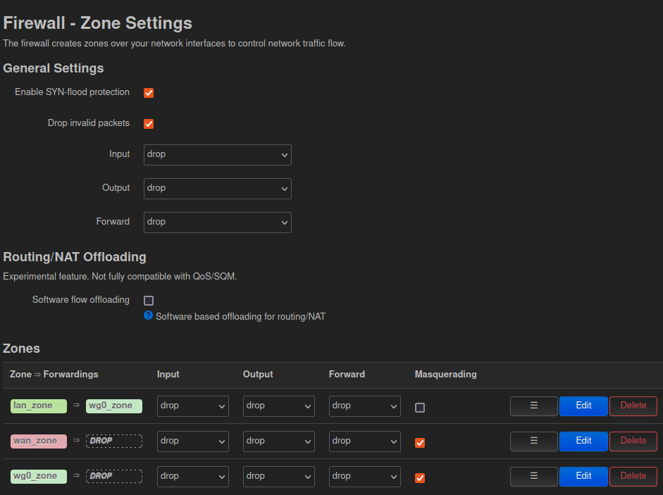 # /etc/config/firewall config zone option name 'wg0_zone' option input 'DROP' option forward 'DROP' list network 'wg0_int' option masq '1' option output 'DROP'