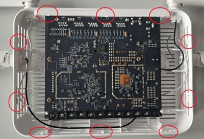 There are 10 clips around the sides of the router. Carefully release them one by one. Each clip can be pushed from the side, and they are visible through the ventilation grille.