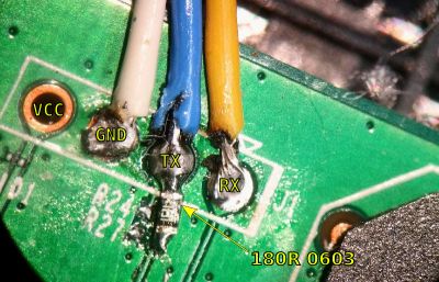 In the lower right is the serial header. The first through hole is TX, second RX and third GROUND. There were two missing resistors at R27 and R24. I placed a 10K on R27 and a 1K on R24 (total shot in the dark based on some reading I had done, but it works). The RX through hole didn't seem to be connected to the right side of the R24 pad so it's got a solder bridge. Use 115200, 8N1, no flow control.